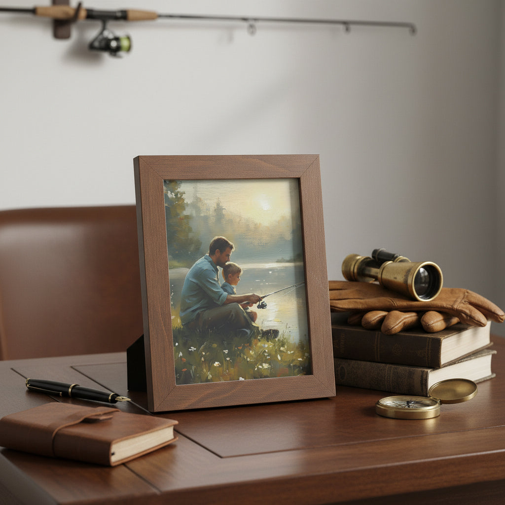 Introduce the warmth of cherished memories into your home with "First Catch," a tender impressionistic painting celebrating the special connection between a father and son. This evocative artwork captures a serene moment of shared experience—fishing by a tranquil lake as the sun gently breaks through the morning mist. The soft brushstrokes and harmonious palette of greens, blues, and golden light create an atmosphere of peace, guidance, and unspoken love.